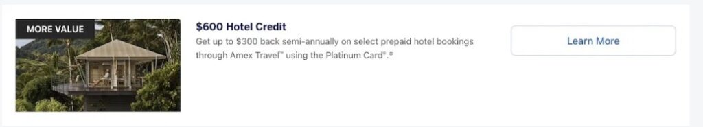 - $600 Hotel Credit – You can receive two $300 semi-annual credits on prepaid Fine Hotels + Resorts or Hotel Collection bookings made through Amex Travel. This credit is applicable for prepaid bookings at Amex Fine Hotels & Resorts or The Hotel Collection through American Express Travel®. For stays in The Hotel Collection, a minimum stay of two nights is required, while Fine Hotels & Resorts allows for a single-night stay.