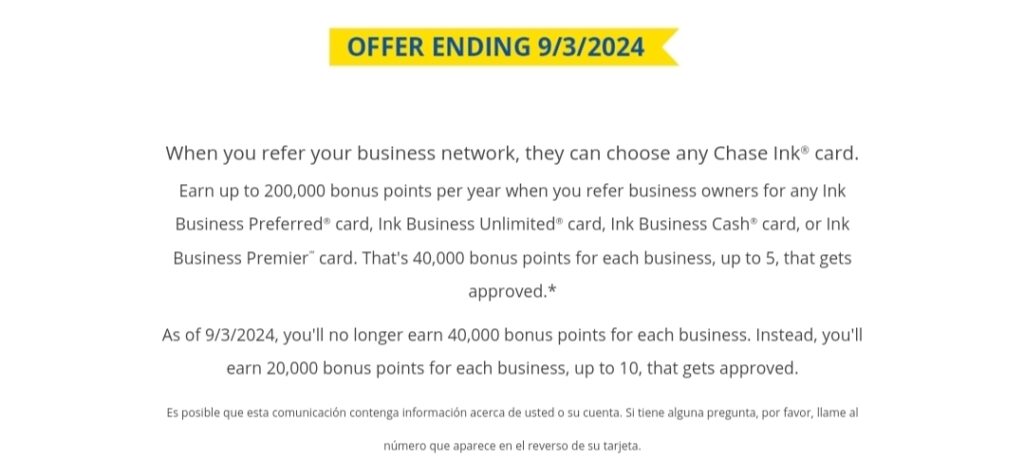 Starting September 3, 2024, Chase will be reducing the referral bonus for the Chase Business Ink Card family back down from 40,000 bonus points to 20,000 bonus points. This offer was increased early 2023 and sadly will be coming to an end.