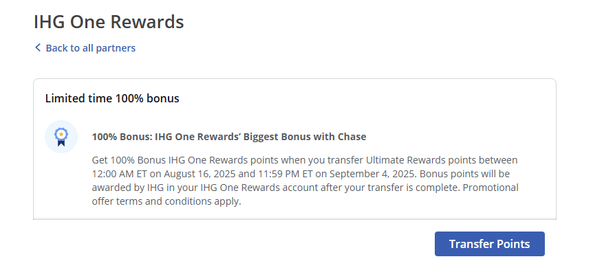 For a limited time, Chase Ultimate Rewards® is offering a 100% transfer bonus when you move points to IHG One Rewards. That means every 1,000 Ultimate Rewards points becomes 2,000 IHG points in your account. The promotion runs from August 16, 2025 through September 4, 2025.